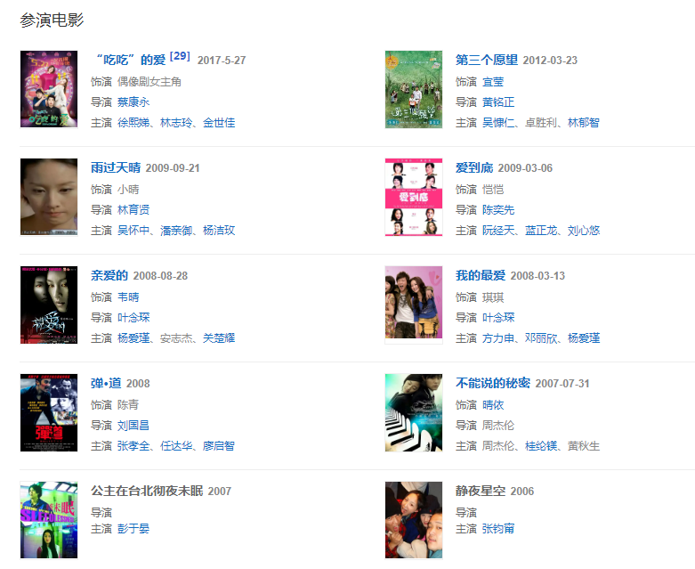 2007年,她憑借在周杰倫自導(dǎo)自演的青春片《不能說的秘密》中飾演女二號晴依獲得四十四屆臺灣金馬獎最佳女配角提名 。