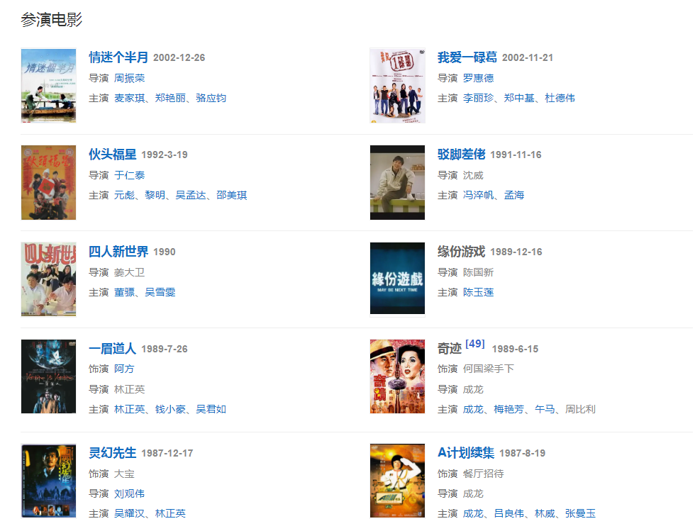 1989年,在由林正英執(zhí)導(dǎo)的恐怖電影《一眉道人》中飾演一眉道長的徒弟阿方。