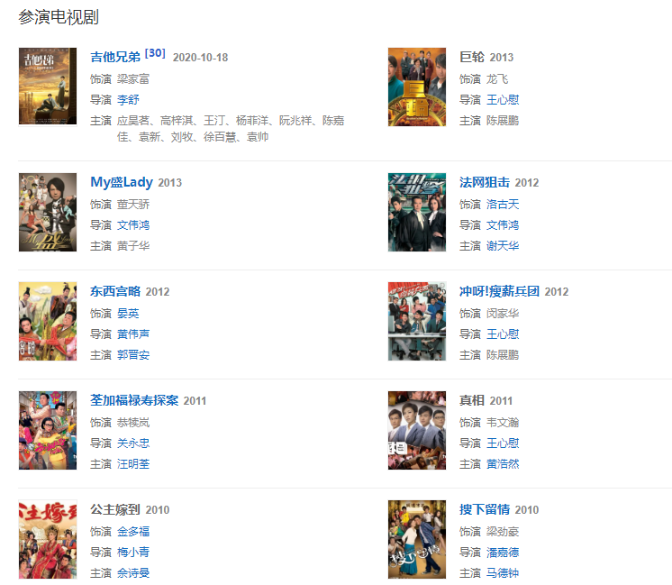 2003年,與薛家燕、苑瓊丹、林文龍共同出演時(shí)裝喜劇《皆大歡喜》,飾演不修篇幅、好逸惡勞的劉錦。2005年7月31日,主演的時(shí)裝喜劇《窈窕熟女》在香港翡翠臺(tái)播出,在劇中飾演為人魯鈍的畢奇理偵探社員工董輝。
