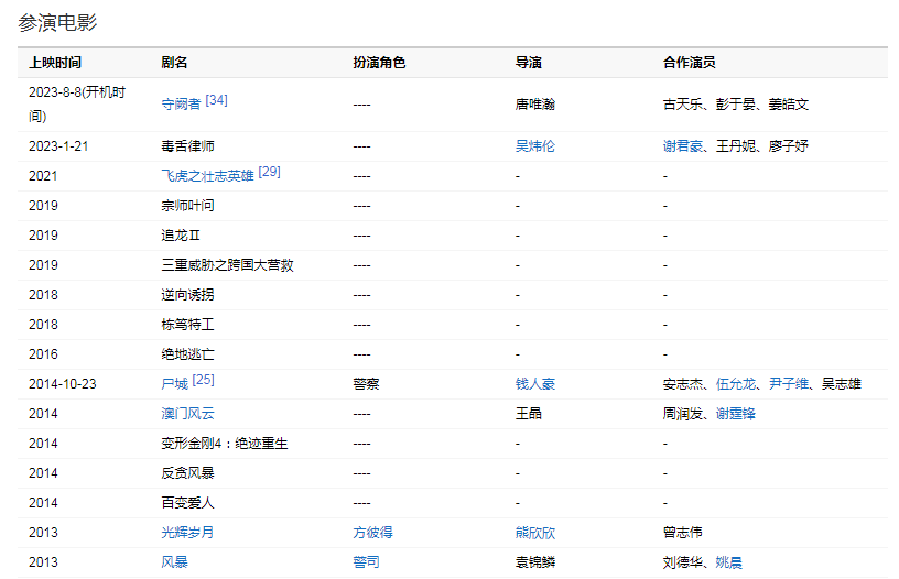 2010年7月,參演爾冬升執(zhí)導的動作警匪片《槍王之王》,飾演一名神秘富豪。