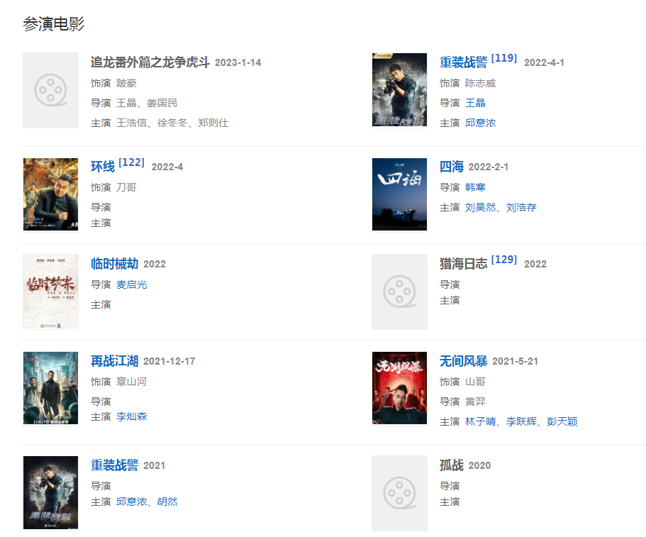 2023年1月14日,主演的動(dòng)作電影《追龍番外篇之龍爭(zhēng)虎斗》在愛(ài)奇藝云影院獨(dú)家上映,在片中飾演跛豪 ;